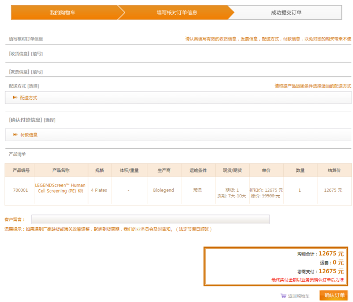 點(diǎn)擊購(gòu)物車頁(yè)面的“結(jié)算”進(jìn)入填寫訂單信息的頁(yè)面,在此頁(yè)面請(qǐng)認(rèn)真填寫,收貨地址、發(fā)票信息、配送方式、支付方式等信息。點(diǎn)擊“確認(rèn)訂單”即可生成訂單。