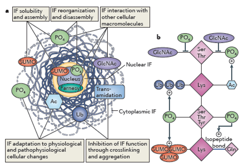 下圖以中間絲蛋白(IF)為例,描述了針對于IF的各種不同PTM對于其蛋白功能的影響: