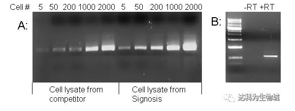 圖2 A: 比較Signosis與其他品牌的細胞裂解液。分別對裂解產(chǎn)物中的β-actin進行30個循環(huán)反轉錄PCR。
