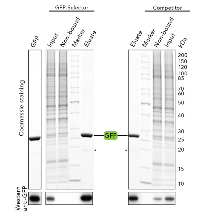 將等量GFP Selector和競爭產(chǎn)品與1ml含GFP標(biāo)記蛋白的HeLa裂解物一起孵育,通過考馬斯染色和蛋白印跡分析上樣、洗滌產(chǎn)物、洗脫產(chǎn)物。