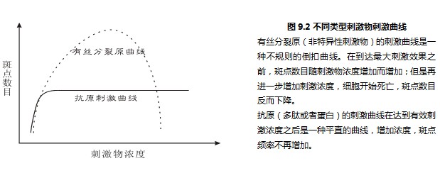 其一、非特異性的刺激物刺激效果不穩(wěn)定。如圖9.2所示,非特異性的刺激物(有絲分裂原Mitogen)的刺激曲線幾乎沒有平坦的部分。也就是說,刺激物的濃度有細(xì)微變化,馬上就會體現(xiàn)在刺激斑點數(shù)目的變化上了,這樣實驗結(jié)果很難完全重現(xiàn)。相反,抗原的刺激曲線非常平坦,只要達到有效刺激濃度,斑點頻率就不再變化。