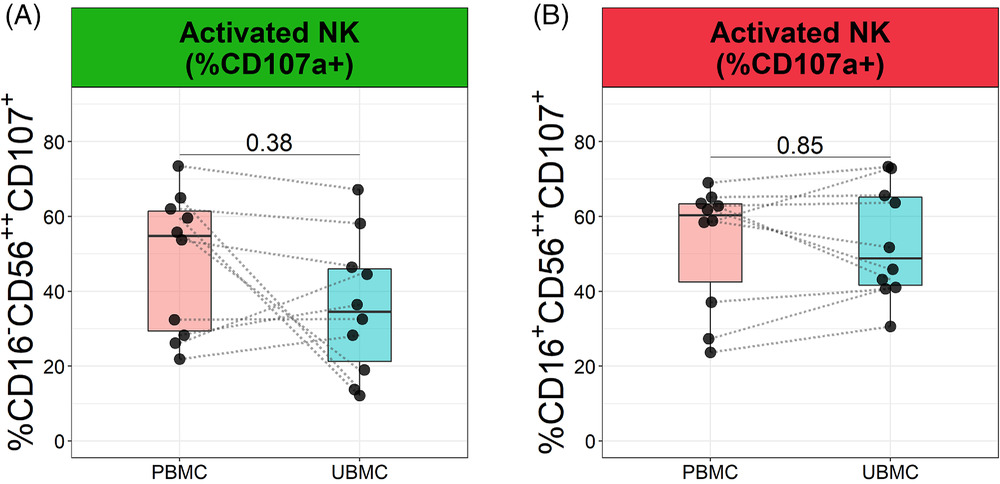 為了比較CD16-CD56++和CD16+CD56++細(xì)胞在胎盤床和外周血中的活化狀態(tài),本文檢測(cè)了細(xì)胞表面脫顆粒標(biāo)志物CD107a的表達(dá)。胎盤床血中活化CD16-CD56++細(xì)胞的百分比與外周血相當(dāng)(分別為35.87 ± 5.84%和47.84 ± 5.91%)(圖3A)。同樣,胎盤床血中活化CD16+CD56+細(xì)胞的百分比與外周血相似(分別為52.86 ± 4.74%和52.76 ± 5.29%)(圖3B)。