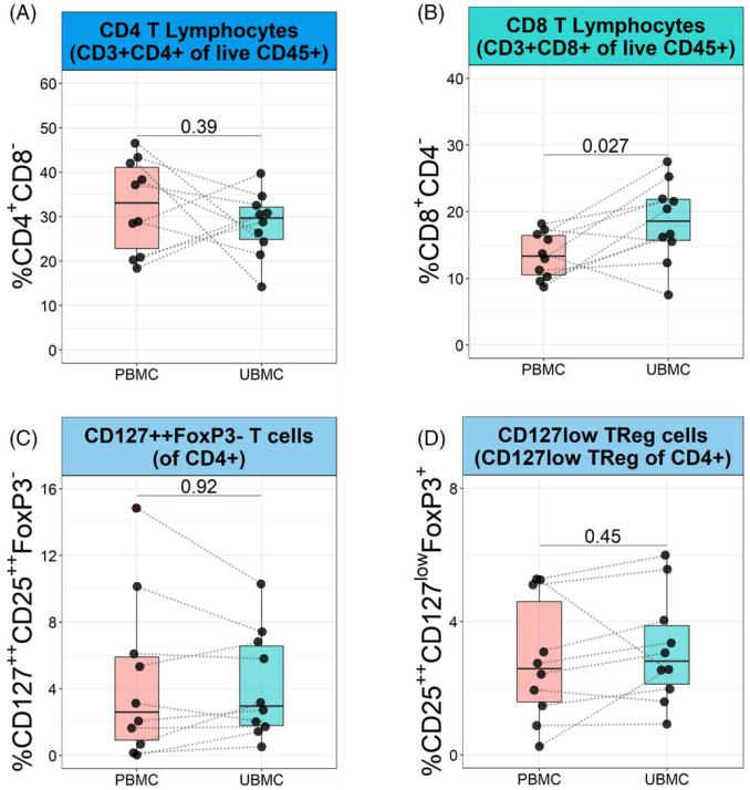 圖7 PBMC和UBMC白細(xì)胞群中T細(xì)胞群的檢測(cè)。