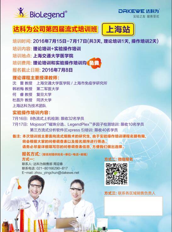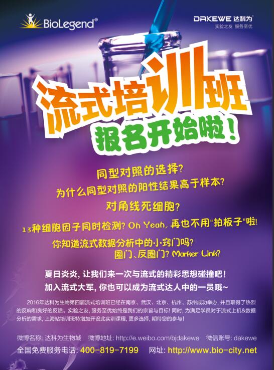 2016年達科為生物第四屆流式培訓(xùn)班已經(jīng)在全國各地火熱舉辦中,第七站上海培訓(xùn)班經(jīng)過前期的彩頁、海報的宣傳,報名工作已經(jīng)接近尾聲。目前上機課程已滿,理論課程還有部分名額,感興趣的學(xué)員,歡迎報名,期待您的參與!