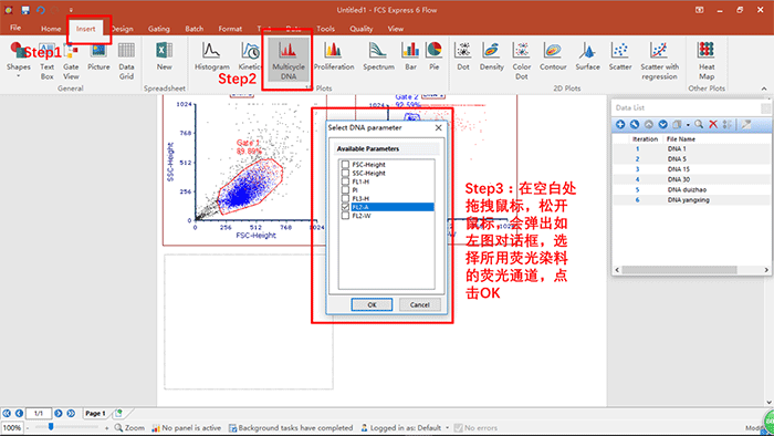 a.粘連細胞去除之后,可直接調(diào)用Denovo自帶的細胞周期分析模板,完成數(shù)據(jù)分析,具體操作如下: