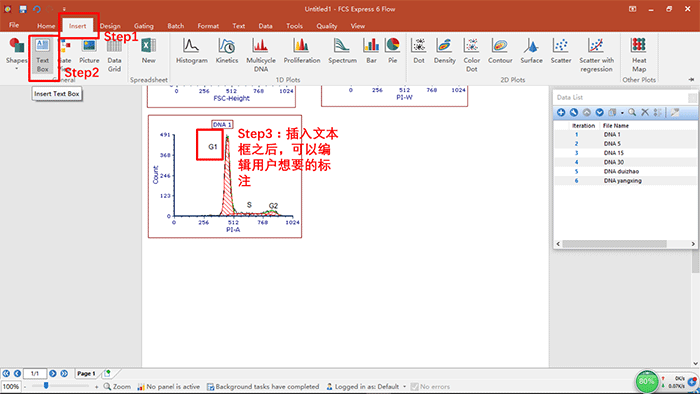 b.將細胞周期分析的模板調(diào)出來之后,點擊OK,會彈出如下圖所示的界面,然后可以利用insert按鈕,插入文本框,從而可實現(xiàn)圖注的編輯,如下圖所示(我們可以對圖中的每個峰進行命名,從而可以對細胞周期中的各個時期進行命名和解釋):