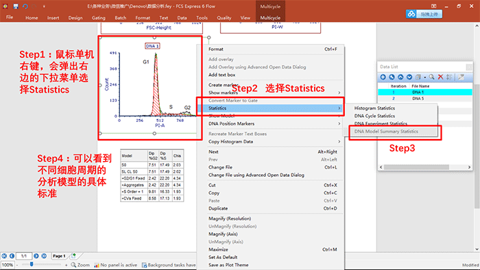 c.當(dāng)完成細胞周期數(shù)據(jù)分析后,接上面一步,可以通過Statistics按鈕,將相關(guān)的參數(shù)調(diào)出來,具體展示如下: