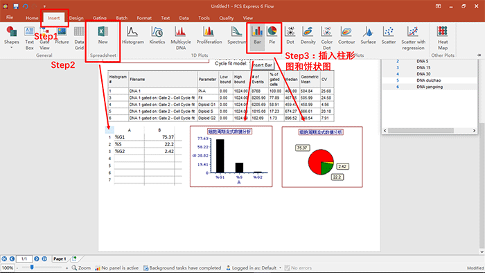 a.舉例,對細胞周期中G1期,S期及G2期各細胞比列的情況分析并做成柱形圖及餅狀圖,直接插入Spreadsheets,然后將相應(yīng)的數(shù)據(jù)拖拽入表格中,點擊insert命令按鈕,插入相應(yīng)的柱形圖和餅狀圖,操作如下:
