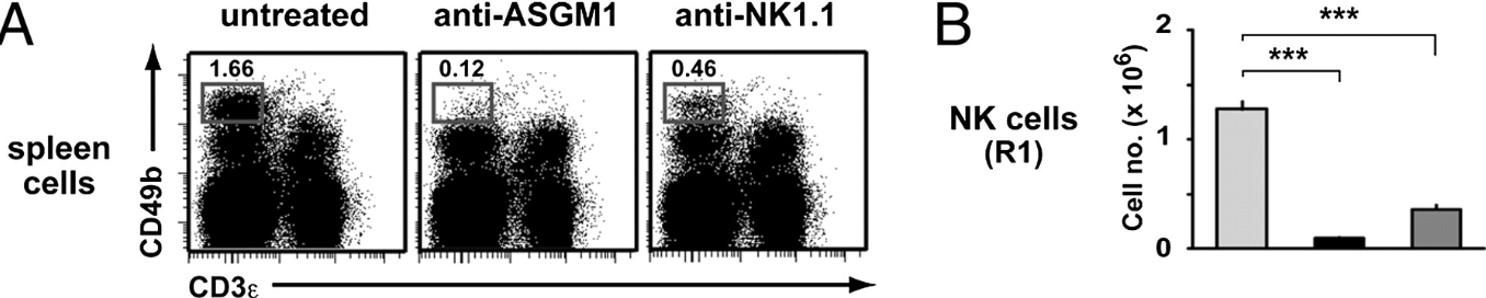 GM1是神經(jīng)節(jié)苷脂,是一種帶有單唾液酸的鞘糖脂。Asialo-GM1是不帶單唾液酸的GM1的衍生物。它表達(dá)在NK細(xì)胞、噬堿性粒細(xì)胞、單核/巨噬細(xì)胞和T細(xì)胞上,特別是早期胸腺細(xì)胞上。該抗體在多種小鼠品系中都可消耗NK細(xì)胞,包括C57BL/6, BALB/c, C3H和A/J小鼠,不顯示出小鼠品系特異性。而NK1.1僅表達(dá)在少數(shù)品系的小鼠上。