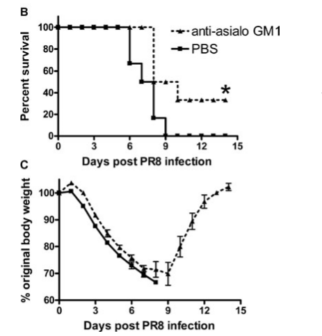 文獻(xiàn)來源:Zhou G, et al. 2013. Eur. J. Immunol. 43:929. 該圖顯示尾靜肪注射anti-asialo GM1或PBS,同時用流感病毒處理,并且每天監(jiān)測小鼠存活率(B)和小鼠體重(C)。顯示,消耗NK細(xì)胞增加流感病毒感染小鼠的致病率和致死率。
