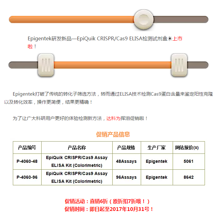 傳統(tǒng)方法操作復雜、花費大量時間與精力,針對這個特點,Epigentek研發(fā)出了通過ELISA檢測Cas9蛋白含量,進而篩選轉(zhuǎn)化子的檢測試劑盒。該試劑盒僅需要純化的Cas9 核酸酶和全細胞提取物(分離自各物種的組織和培養(yǎng)的細胞),就能夠特異性定量檢測CRISPR相關(guān)蛋白9(Cas9,dCas9)。