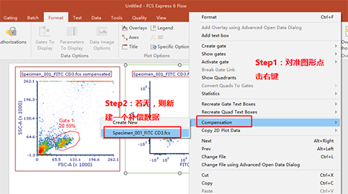 此時(shí)可以手動(dòng)調(diào)節(jié)兩通道之間的補(bǔ)償,該數(shù)據(jù)為FITC單管,可用PE-FITC調(diào)節(jié)FITC滲漏到PE通道去的熒光。步驟如下圖所示: