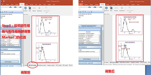 依次調(diào)整好各單管Control的Marker門的位置。此處不一一列舉。回到補(bǔ)償界面。此處的3、4適用于使用補(bǔ)償beads調(diào)節(jié)補(bǔ)償?shù)那闆r(由于本次數(shù)據(jù)為細(xì)胞,此處不詳細(xì)列出,如對(duì)此步驟感興趣,可咨詢小達(dá)君)