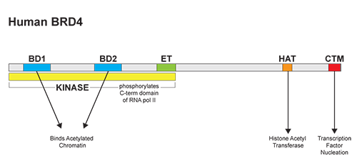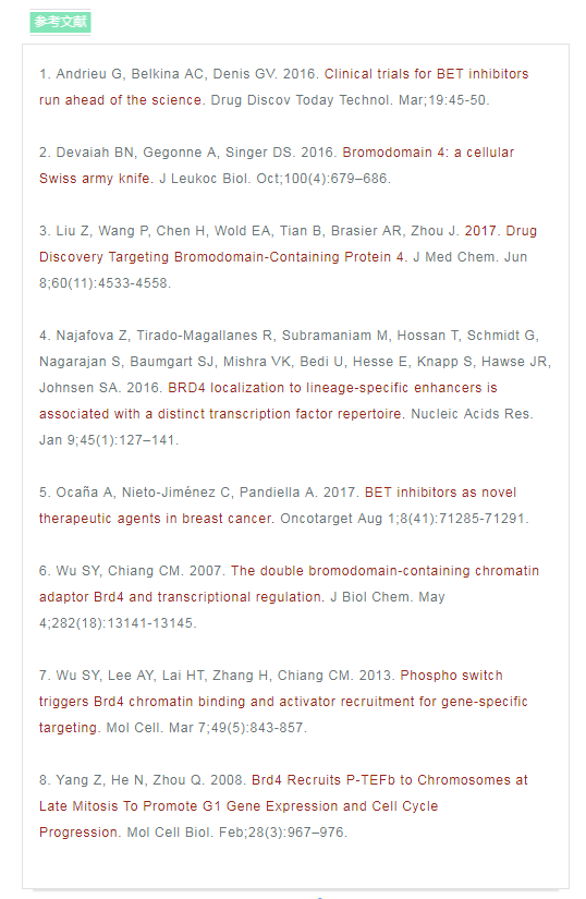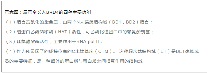 溴結構域蛋白的BET家族的主要特征是它們都存在兩個溴結構域和一種超末端(ET)結構域2,6。其中,BRD4是研究較深入的。 BRD4具有四個主要的分子功能:(i)可以通過結合乙?;M蛋白維持染色質(zhì)結構,這種活性是由它的N-末端結構域中的位點調(diào)控的; (ii)可以通過其HAT催化結構域發(fā)揮組蛋白乙酰轉移酶(HAT)活性2,6; (iii)絲氨酸激酶活性,主要作用于RNA pol II;(iv)C端結構域,可以發(fā)揮轉錄因子和復合物的結合和成核位點。研究發(fā)現(xiàn),BRD4常出現(xiàn)在幾種轉錄復合物,包括常見的輔因子調(diào)控子和P-TEFb 延伸因子6。 其C端結構域也可以調(diào)控BRD4與許多眾所周知的轉錄調(diào)節(jié)因子之間的相互作用,顯著的有:P-TEFb,MYC,NFκb 以及p532,4,6-8等。