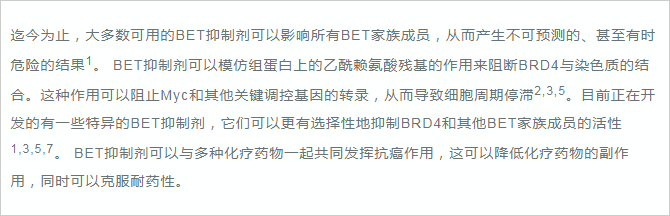 BRD4(溴結構域蛋白4)是一種轉錄調(diào)節(jié)因子。研究發(fā)現(xiàn),BRD4在癌癥、自身免疫和炎癥性疾病中具有重要的作用1,2。 正常生理情況下,BRD4主要參與細胞周期過程中的基因表達調(diào)控,其可以與乙?;旧|(zhì)結合,保持各種基因在細胞分裂循環(huán)過程中的穩(wěn)定表達 ,這種現(xiàn)象被稱為表觀遺傳記憶或基因轉錄的“書簽”2,7。 同時,BRD4在調(diào)控分化和發(fā)育中也起著關鍵作用2,4。 如果BRD4缺失,骨髓干細胞將不能分化成為B和T細胞2。 BRD4亦是MEFs或B細胞重編程為誘導多能干細胞過程中重新表達干細胞基因所必需的,在成骨細胞分化過程中BRD4也發(fā)揮重要作用。 綜上,BRD4在細胞周期調(diào)控和分化中的重要作用使其成為癌癥和免疫系統(tǒng)疾病的新興治療靶點。
