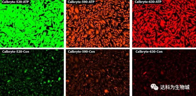 Response of endogenous P2Y receptor to ATP in CHO-K cells. CHO-K cells were seeded overnight at 40,000 cells per 100 μL per well in a 96-well black wall/clear bottom costar plate. 100 μL of Calbryte? 520 AM (left), Calbryte? 590 AM (middle) or Calbryte? 630 AM (right) in HHBS with 2 mM probenecid were added into the wells, and the cells were incubated at 37 °C for one hour. The dye loading mediums were replaced with 200 μL HHBS, treated with 50 μL of 50 μM ATP, and imaged with a fluorescence microscope (Keyence) using FITC channel (Calbryte? 520), TRITC channel (Calbryte? 590) or Texas Red channel (Calbryte? 630).
