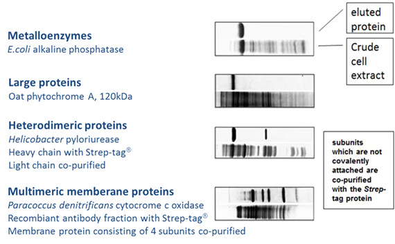 因His-tag系統(tǒng)使用Ni離子,所以在純化金屬蛋白(多數(shù)為酶)時,可能會受到金屬間交互作用的干擾。而使用Strep-tag? 則不會出現(xiàn)此問題,因為Strep-Tactin? XT與Strep-tag?的特異性結(jié)合不受金屬離子影響。且因其溫和的純化流程,所以還能用于純化大型蛋白、多亞基的蛋白復(fù)合體或是跨膜蛋白,并且保持蛋白功能。以Strep-tag?系統(tǒng)純化出不同的蛋白實(shí)例如下: