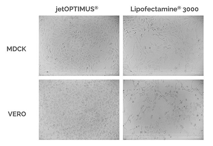 △圖2. 使用jetOPTIMUS?轉(zhuǎn)染24小時(shí)后,細(xì)胞仍然健康并保持良好形態(tài)。根據(jù)L3K和jetOPTIMUS?說(shuō)明書要求進(jìn)行轉(zhuǎn)染,24小時(shí)后在相差顯微鏡下觀察MDCK和VERO細(xì)胞的狀態(tài)。