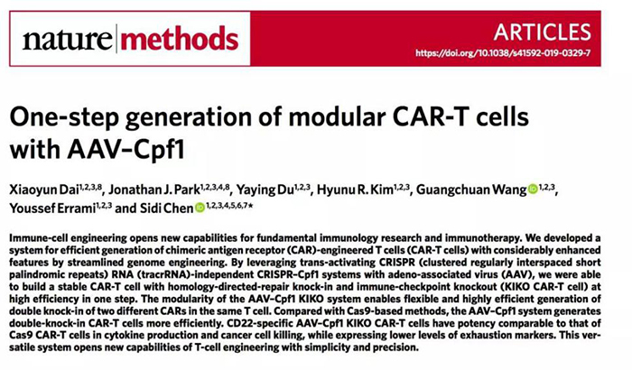 作者利用腺相關(guān)病毒( AAV )CRISPR -Cpf1系統(tǒng),開發(fā)了一種高效的制備的Car-T的方法,而且具有顯著增強(qiáng)的特征。該技術(shù)使得Car-T制備的高效性大大提高。