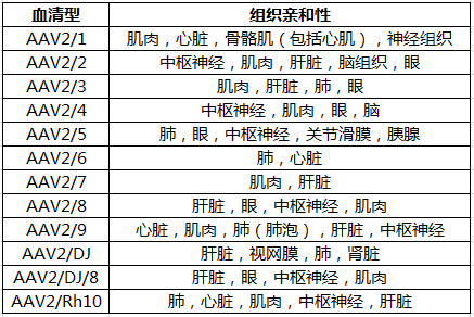 目前發(fā)現(xiàn)的AAVAAV1~AAV11、DJ12種不同的血清型,主要區(qū)別在于衣殼蛋白Cap的不同,并決定不同血清型AAV對不同的組織和細(xì)胞有不同的感染效率。