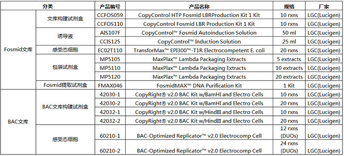 LGC(Lucigen)提供Fosmid文庫構(gòu)建試劑盒,該試劑盒中的Fosmid載體是行業(yè)金標準(原屬于Epicentre產(chǎn)品),可完成各種生物樣本編制完整和無偏向的Fosmid文庫,利用自動誘導液保證單拷貝和誘導高拷貝數(shù)量的需要。
