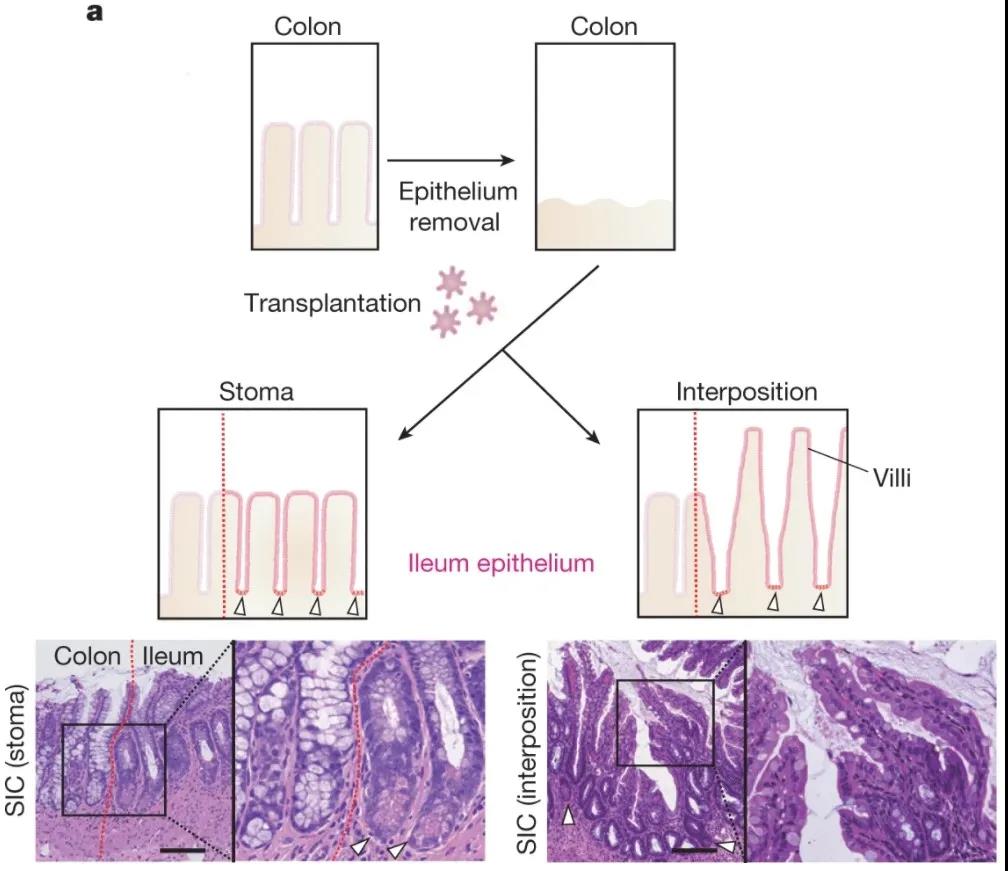通過上皮置換產(chǎn)生SIC的策略。頂部,結(jié)腸上皮被去除(EDTA處理),然后回腸類器官被移植。在進行介入手術(shù)之前,移植的回腸上皮顯示出隱窩狀結(jié)構(gòu)(左下圖和圖像)。移植后,會形成絨毛狀結(jié)構(gòu)(右下圖和圖像)。白色箭頭表示潘氏細胞。