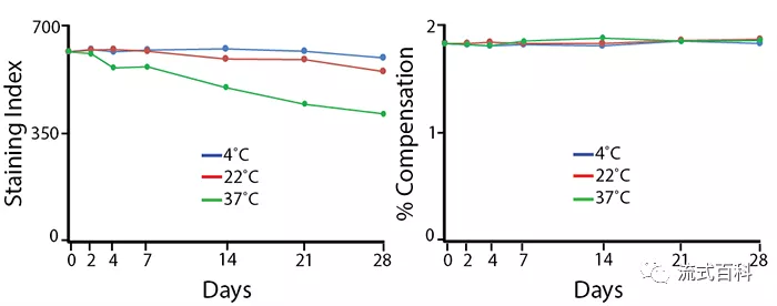 將PE/Fire? 700標(biāo)記的抗體分裝后分別保存在4℃、22℃和37℃下。穩(wěn)定性可以根據(jù)抗體的染色指數(shù)(staining index)和熒光補(bǔ)償百分比來衡量,隨著保存時(shí)間的延長,3種溫度保存條件下光補(bǔ)償百分?jǐn)?shù)并沒有發(fā)生改變,但是37℃的保存條件染色指數(shù)下降了約36%,22℃保存條件的染色指數(shù)下降了約12%,這主要是由于這兩種保存條件下抗體的非特異性染色背景升高引起的(檢測平臺為5激光Cytek? Aurora 光譜流式)。