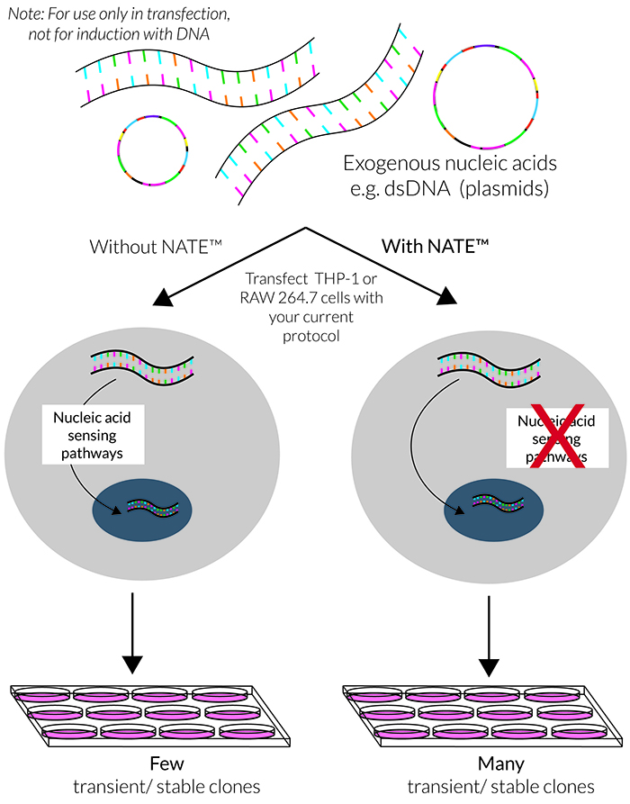 在真核細(xì)胞轉(zhuǎn)染期間,外源核酸(如質(zhì)粒DNA)的主要障礙是它們會(huì)被胞質(zhì)傳感器檢測(cè),如cGAS/STING,AIM2炎癥小體和LC3介導(dǎo)的自噬。這些防御性級(jí)聯(lián)信號(hào)的激活通常會(huì)導(dǎo)致低轉(zhuǎn)染效率、降低的細(xì)胞活力和不一致的結(jié)果,尤其是在難轉(zhuǎn)細(xì)胞(如免疫細(xì)胞)的轉(zhuǎn)染實(shí)驗(yàn)中。NATE?抑制許多核酸感應(yīng)途徑,從而保護(hù)外源DNA并促進(jìn)其表達(dá)。
